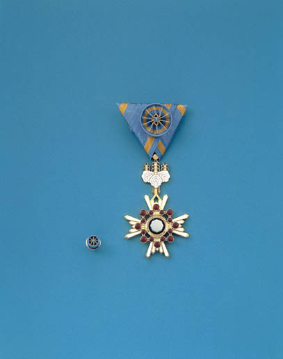 明治21年に制定されました。勲章のデザインは、古代の宝であった宝鏡を中心に大小16個の連珠を配して、四条ないし八条の光線を付し、紐※には桐の花葉を用いています。 ※ 紐・・・ちゅう 出典:内閣府